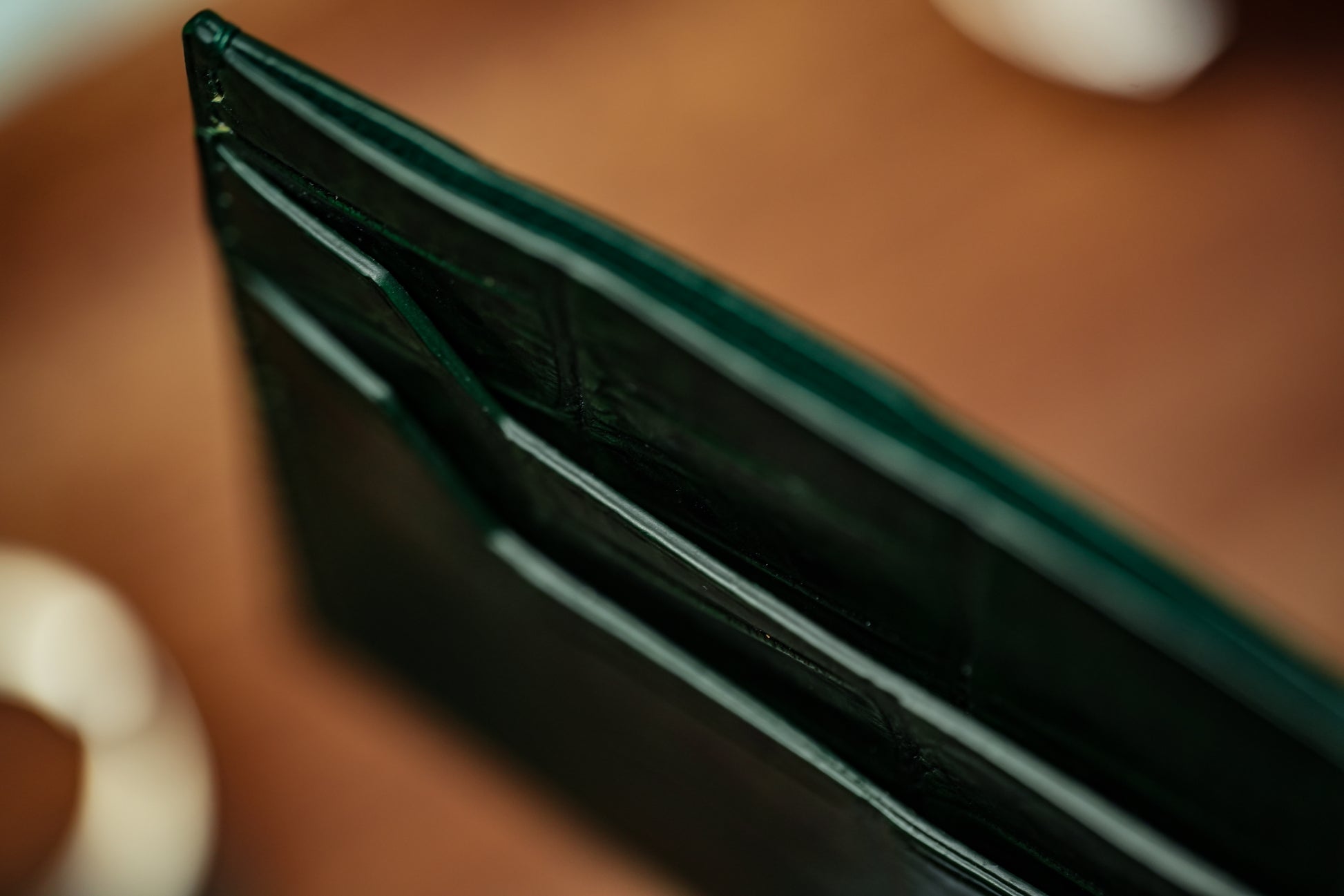 Material used for each holder is crocodile skin, which is classified as exotic due to its rarity and the timeless craftsmanship required to produce a finished hide for production uses.