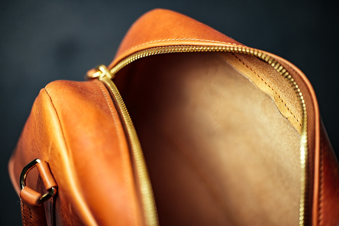 Leather used for each bag is Missouri, medium-firm, vacchetta-based leather, so it's hot stuffed with just the right amount of fats and oils to give the flesh a moderately dense consistency without feeling greasy.